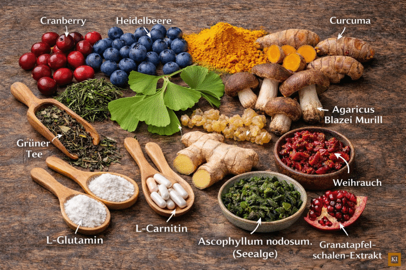 Cranberry, Heidelbeere, Curcuma, Grüner Tee, Ginkgo biloba, Ingwer, Agaricus Blazei Murill, Weihrauch, Granatapfelschalen-Extrakt, L-Carnitin, L-Glutamin, Ascophyllum nodosum, eine Seealge