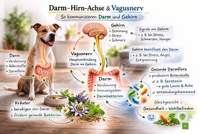 Die Darm-Hirn-Achse beim Hund beschreibt genau diese Verbindung. Sie erklärt, warum Stress Durchfall auslösen kann. Warum Angst auf den Magen schlägt. Und warum Kräuter nicht nur im Darm, sondern auch im Nervensystem wirken können.