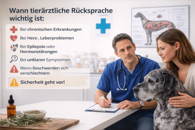 Eine tierärztliche Rücksprache ist wichtig bei chronischen Erkrankungen, Herz oder Leberproblemen, Epilepsie, Hormonstörungen oder dauerhafter Medikamentengabe.