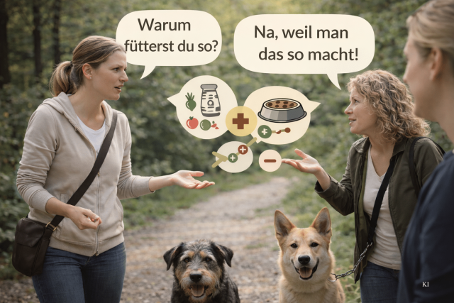 Die beiden Frauen waren sofort im Thema. Erst ganz locker, so wie es immer anfängt: „Was fütterst du eigentlich gerade?“ Und ehe man sich versieht, ist man mitten in einer Diskussion, die klingt, als ginge es um Staatsgeheimnisse. Die eine schwört auf das eine Konzept, die andere auf das nächste. Mal geht es um Protein, mal um Kohlenhydrate, mal um Zusätze, mal um „das Immunsystem“. Und zwischendurch fallen diese Sätze, die in der Hundewelt immer fallen, wenn es ums Futter geht: „Also ich würde das ja niemals geben.“ Oder: „Das ist doch alles nur Industrie.“ Oder: „Das ist Gift.“