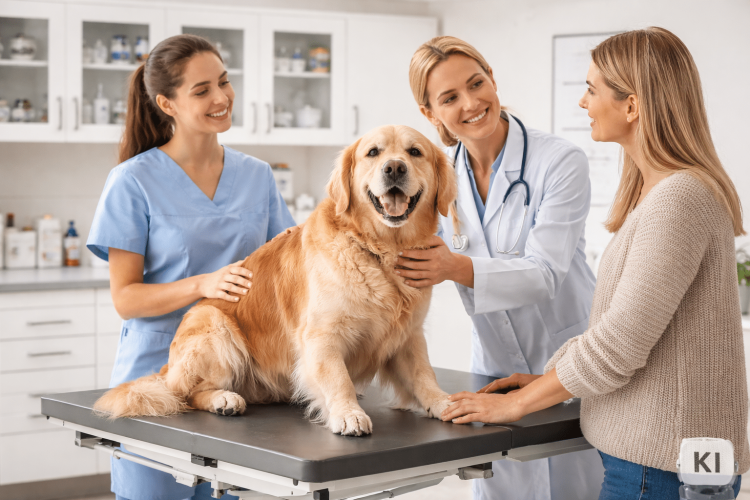 Hund wird in einer Tierarztpraxis gemeinsam von Tierärztin und Tierarzthelferin auf dem Untersuchungstisch untersucht, während die Halterin daneben steht.