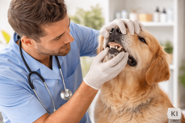 Tierarzt untersucht in einer Tierarztpraxis die Zähne eines Hundes, indem er vorsichtig die Lefze anhebt und ins Maul schaut.