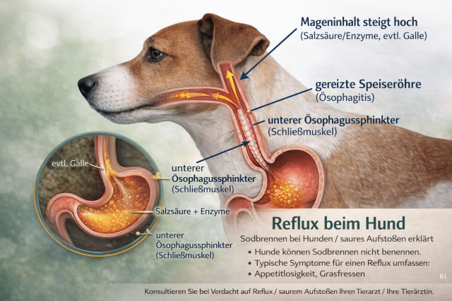 Beim Hund ist das nicht so eindeutig, weil er dieses Brennen nicht „benennen“ kann. Was Halter*innen als „Sodbrennen“ beobachten, ist deshalb in der Praxis meistens Reflux. Das bedeutet: Mageninhalt fließt zurück in Richtung Speiseröhre und reizt dort die Schleimhaut. Die Speiseröhre ist dafür nicht gemacht und reagiert empfindlich, zum Beispiel mit Übelkeit, Schleim, Schmatzen oder Würgen.