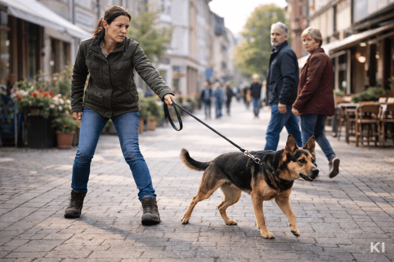 Konsequenz in der Hundeerziehung: Halterin greift ein und sichert ihren Hund in einer belebten Kleinstadt