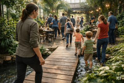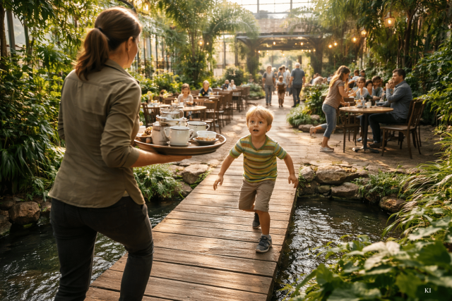 Während meines Studiums habe ich immer wieder als Kellnerin gearbeitet, unter anderem in einem Café, das tatsächlich ein Wintergarten war. Ein großer, lichtdurchfluteter Raum mit tropischen Pflanzen, Wasserläufen und kleinen Brücken. Für Gäste ein besonderer Ort. Für Kinder ein Abenteuerspielplatz.